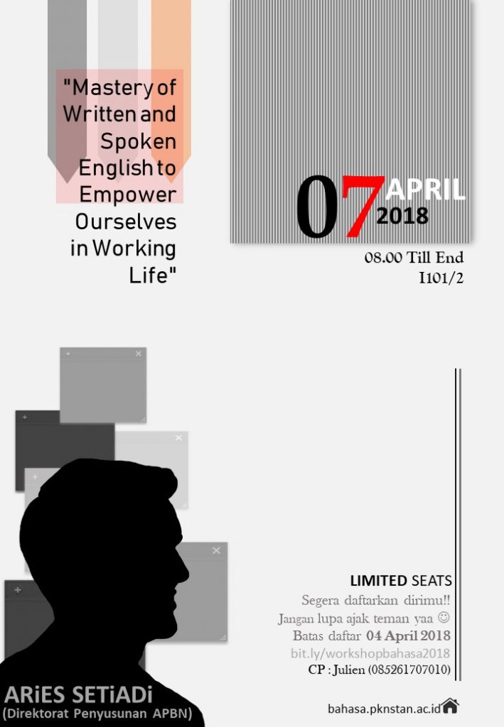 Pengumuman PENGUMUMAN HASIL EPT (ENGLISH PROFICIENCY TEST) BAGI MAHASISWA PKN STAN TAHUN 2018 Click here "Mastery of Written and Spoken English to Empower Ourselves in Working Life" Klik tema workshop untuk daftar!!#Pesertaterbatas :))